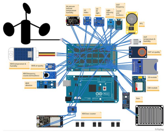 The system was installed in such a way to avoid disturbing the bee ecosystem and prevent the impact of direct exposure to the weather in order to avoid measurement errors. For example, individual sensors that are exposed to direct sunlight are protected by clear glass without UV stabilizers to avoid measurement errors. Sensors for the detection of gases, frequencies, and noise were placed in such a way that they could record without interference and without being affected by weather conditions or direct sunlight.