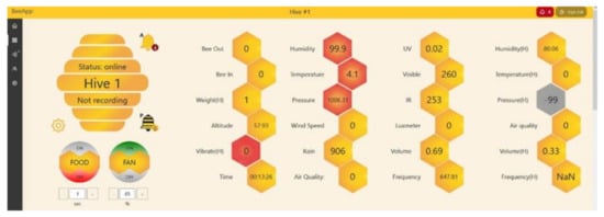 Cells that display values in the application are dynamic and change colors in relation to the displayed values. The analytical alarm is triggered when the measurement value approaches the critical value, for example, in the case of high temperature and high humidity. When the temperature value inside the hive exceeds 35 °C [68] or the relative humidity is nearly 90%, the alarm is triggered. A push notification is sent informing about changes in the hive.