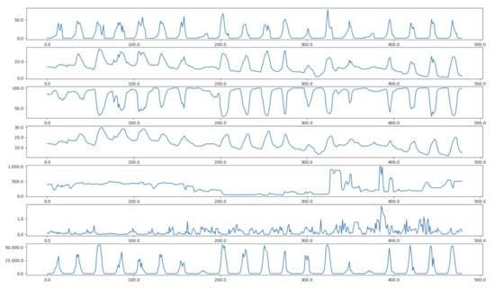 Some of the used variables and output variable Bee_IN (y) are shown in Figure 6. On the basis of the time-series shape, it is obvious that some of these variables were important for our model, such as lux or outside humidity (when the humidity value is high, the bees do not leave the hive).