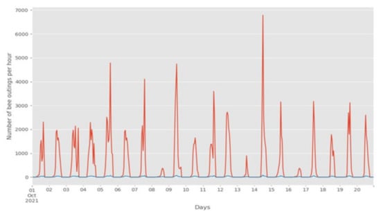 Comparisons of the experimental data against the model showed that our model represents the observed processes well. This is indicated by the results shown in the figures. According to the obtained results, the best model could achieve reliable bee activity prediction, with an error of only 8.9 missed bees per hour for bee exits from, and 7.8 missed bees per hour for bee entrances in a hive. We expect to see higher errors per hour when measurements are produced in the spring and summer months, and that additional feature engineering can help in model improving.