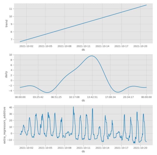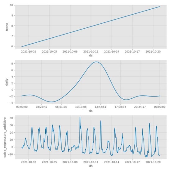 where is the trend function that models nonperiodic changes in the value of the time series, represents periodic changes (e.g., weekly and yearly seasonality), and represents the effects of holidays that occur on potentially irregular schedules over one or more days. Error term represents any idiosyncratic changes not accommodated by the model. The detected components for the entire BEE_OUT time series, trend, daily behaviour, and the influence of the added regressors are shown in Figure 8. Similar graphics were obtained for the entire BEE_IN time series (Figure 9).