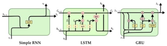 There are three types of vanilla recurrent neural network: simple (RNN), gated recurrent unit (GRU), and long short-term memory unit (LSTM). The difference among them is shown in Figure 10, but we omit the details because they are outside the scope of this paper. Long short-term memory (LSTM) networks were invented by Hochreiter and Schmidhuber in 1997 [72], and they set accuracy records in multiple application domains. Here, LSTM cells were used for the time-series modeling.