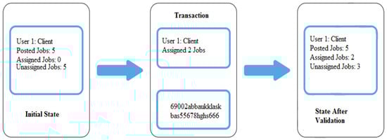 Validate: Checking the job validation, i.e., either available or assigned and active or canceled. When ordering the transaction, the confirmation of posting authority with identity and other details are specified. Validation steps help to avoid the double-spending problem, i.e., making the same deal with more than one professional in our system case. Figure 2 illustrates the validation of the transaction in the case of our system.