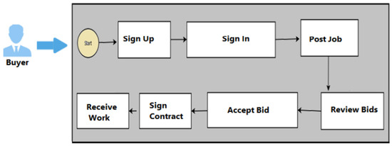 As described earlier, there were two main system actors: seller and buyer. Sellers are freelancing professionals in our proposed system and clients are buyers. Both types of system actors have different work processes in the system. First, we define the buyer’s work process in the system. Figure 3 illustrates the buyer work process.