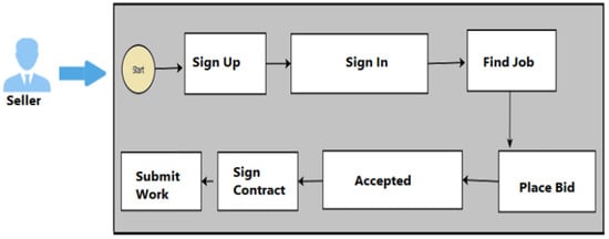 As in the case of the buyer, the seller also signs up and signs in to successfully start the system as shown in Figure 4. After signing into the system, the seller can find jobs posted by buyers, as discussed earlier. After searching for a job according to interest and professional field, they can place a bid on the job. More than one seller can place a bid on a single job. Buyers can review all bids placed by several sellers on the posted job. Based on some personal criteria, the buyer accepts a single proposal out of many. The seller will be notified accordingly upon acceptance by the buyer. The buyer initialized the agreement by accepting the bid of the seller. After that, the seller responds to the understanding and places the biometric signature on the smart contract. After this step, the transaction will become part of the blockchain, and the information will be dispatched to each stakeholder via blockchain. One copy of the data will also be saved into the database in hashed format for recovery if required. After completing the job, the seller will submit the job to the buyer based on the job specifications described earlier in the agreement. If the requirements are fulfilled in the submitted work, the smart contract will be executed, and the state of the transaction will be changed accordingly.