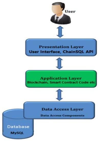 The presentation, application, and data access layers in the proposed decentralized freelancing system are shown in Figure 5. From the user’s perspective, the presentation layer is a high-level layer that interacts with the system. Users perform required operations on a system via the presentation layer. The application layer holds the system’s core libraries, binaries, and coding between the system database and the interface. The innermost layer of the system is the data access layer. From the user’s perspective, the data access layer is a low-level layer and holds the actual database schema. As the name suggests, the data access layer is responsible for accessing the data from the database according to the queries generated by users from the presentation layer. After accessing the data from the database, the data access layer transmits data to the layer above it, i.e., the application layer. The application layer shows the data to the presentation layer according to rules defined in the application layer. The layered model of the system, discussed specifically from blockchain architecture, has four layers and holds some differences from the traditional layered architecture. Blockchain layered architecture consists of a presentation, decentralized application, and hardware [38].
