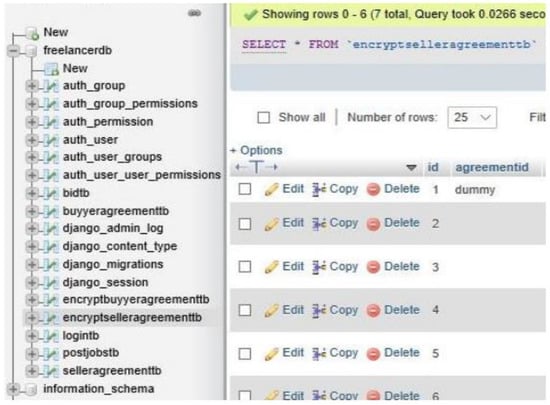 ChainSQL has blockchain integrity and can process queries of the traditional database systems quickly [39]. The building blocks of ChainSQL include application interface, network consensus, database operations, and access grants. The application interface provides access to the blockchain. Our proposed decentralized freelancing system sends commands in SQL format. The given commands are wrapped up in transaction format by the application interface and dispatched to the Blockchain network for agreement. Network consensus is paramount to data integrity. If agreement on the transaction is not achieved, the transaction is restricted to become a part of the blockchain. Precisely to our system context, if an agreement is not achieved between buyer and seller after the buyer accepts the seller’s bid, all existing operations are rolled back, and the transaction does not change its state from available to assigned. The transaction will become part of the blockchain and database once an agreement between both parties is achieved. After achieving a consensus, the blockchain transmits the data of transactions to the concerning database. The database maintains the record of all transaction data and can be retrieved when required via a traditional database’s easy query processing mechanism. Figure 6 illustrates the database design of the system. The owner can authorize or deauthorize the rights of several operations via simple SQL commands.