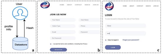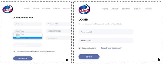 Figure 7a describes the steps required for creating the user profiles. During the sign-up phase, all the details about users are stored in the data store. The unique user id must be guaranteed with hashing. Detailed information is required to register with the system for both users, i.e., buyers and sellers. The information that is collected from the users at the time of profile creation is name, username, user type, email, phone, and password. Figure 7b illustrates the registration interface of the system. Upon successful registration with the system, the user can log into the system by providing the valid credentials set at registration. The login interface of the system is shown in Figure 7c.