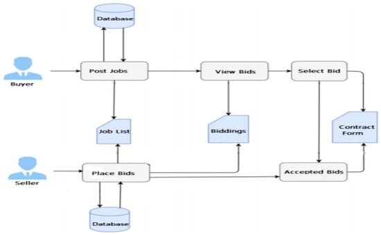 Figure 8 display the graphical representation of the job posting and bid placing mechanism in the system. For posting a job in the system, the buyer provides the required details and information about the job, including the job’s title, the job’s budget, the time required to complete the job, skills needed to handle the job, and a detailed description about the job. Once the required details are provided, the job is appended into the database and becomes visible in the uploaded, but unassigned jobs list. All details entered with the job become public and visible to every seller. Sellers can select a job according to their skills and expertise from the list and place a bid. The freelancer submits a detailed proposal and bid amount on the posted job to establish a bid on the job.