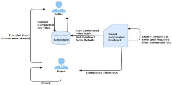 The smart submission contract in this diagram is a code that validates specific details from the smart contract form signed by the buyer and seller with the biometric signatures as described in the previous section. Smart submission contract marks the job completion time and requirements on the contract form and displays the report to buyer, i.e., valid or invalid. If the job is marked valid and completed by smart submission contract, it retrieves the submitted files and sends them to the buyer. The buyer checks the files submitted by the seller and confirms the job completion.
