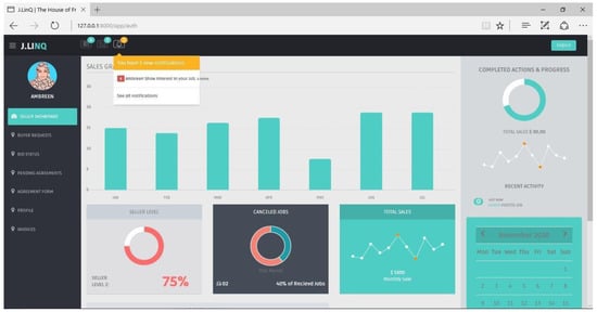 User dashboard provides the facility for users to perform almost all system functionalities for which they join the system. As shown in Figure 11, the user dashboard allows the users to access different operations, including the current month’s statistics, messages, notifications, total sales, an average of canceled sales, recent activities in the system, bid status, pending agreements, invoices, buyers request, and calendar, on the first page of the dashboard.
