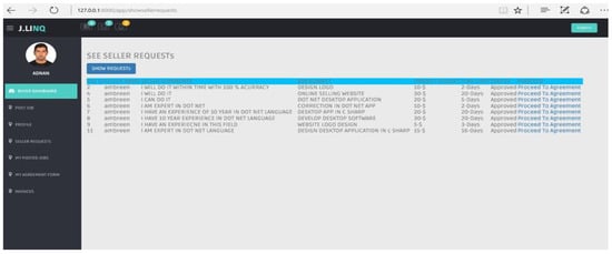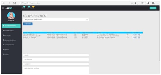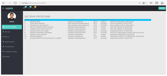 Posting a job on the platform system requires some mandatory input fields to be completed to add job details, such as the subject of the job, nature of the job, budget, time duration for completing the job, job description, and files of job to upload if required. After entering the data in all the necessary input fields, the user can post the job. All posted jobs by the same buyer are visible in the form of a list at the next tab of the dashboard. Figure 14 shows the list of all posted jobs by the same buyer.