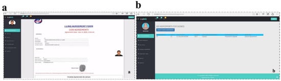 The required fields for successfully registered users are name, user id, type, mobile number, and password. Submitted user details are stored in the database. Additionally, with each agreement in the system, a hash of user information is associated with the transaction to identify the user based on unique constraints, such as email, user id, and mobile number. The user registration form requires only basic information from users. Users can modify their information and add extra information in their profile, i.e., profile pictures and addresses, from their private dashboards generated for each user upon successful registration with the system. Users can land on their dashboards after the successful login to the system. Figure 10b illustrates the login interface of the system. The user has to enter valid credentials to access the private dashboard and profile at the system’s login interface.