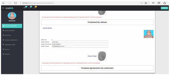 As shown in Figure 17b, the seller has two options: either proceed towards signing the contract form or cancel the transaction. In our case, to test the system functionality, we moved towards signing the contract form. Once the seller clicks on the “Proceed to Sign” link shown in Figure 6 and Figure 10, the system displays the contract form to the seller, which was signed by the buyer earlier with a biometric fingerprint and which holds the job details in it. To confirm the agreement, the seller places the biometric signature on the contract form, and the agreement between buyer and seller will be achieved, as shown in Figure 18.
