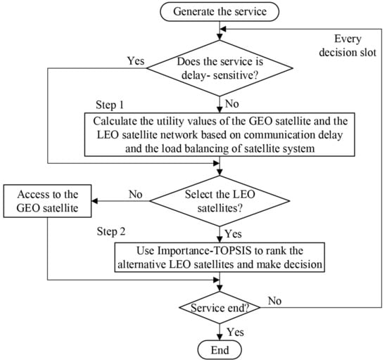 In the overall strategy, users need to select one satellite to connect from a GEO satellite and several LEO satellites within the coverage. A GEO satellite has higher orbital altitude than LEO satellites, which will lead to a larger propagation delay, so it is not suitable for some services that are more sensitive to delay. Due to the rapid movement of LEO satellites, users may need to switch several times during the communication. Therefore, users need to decide whether to connect to the LEO satellites according to the services delay tolerance and the load status of the LEO constellation. If the user chooses to connect to LEO satellites, the appropriate LEO satellite should be selected according to other factors. So, we propose a two-step access and handover strategy, which consists of the network selection based on utility function and the LEO satellite selection based on the Importance-TOPSIS. Figure 2 shows the process of the two-step access and handover strategy.