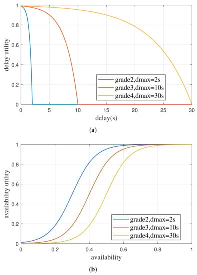 Figure 3a,b is the delay utility function and the availability utility function of different grades of services. As the services of grade 1 is time-sensitive and can only connect to LEO satellite, only the services of grade 2, 3, and 4 is calculated.