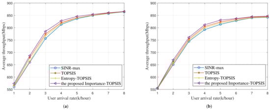 We compare the average throughput of the four schemes under different user arrival rates. As shown in Figure 4, the system tends to be saturated when the user arrival rate reaches 7000 per hour. The Importance-TOPSIS scheme proposed in this paper has the best performance in average throughput, followed by the ordinary TOPSIS scheme with equal weights of all attributes. There is a slight difference between the Entropy-TOPSIS scheme and the SINR-max scheme in throughput, and the entropy weight TOPSIS method is slightly better.