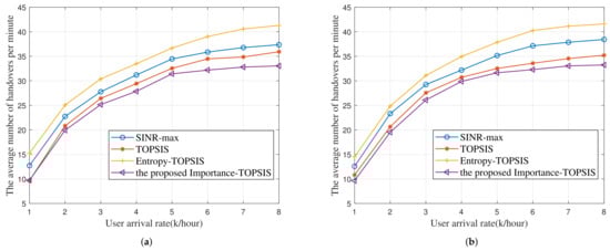 Figure 5 shows the number of handovers per minute at different user arrival rates. It can be seen that the Importance-TOPSIS scheme proposed in this paper has the least average handover times, followed by the ordinary TOPSIS scheme, and the Entropy-TOPSIS has the most average handover times. The SINR-max scheme is more likely to select the same satellite in several consecutive selections, and the handover time is less than that of the Entropy-TOPSIS scheme. The Entropy-TOPSIS scheme considers the entropy of each attribute value of candidate satellites when setting the weight. It can be seen that this weight setting method is not helpful in reducing the handover times.