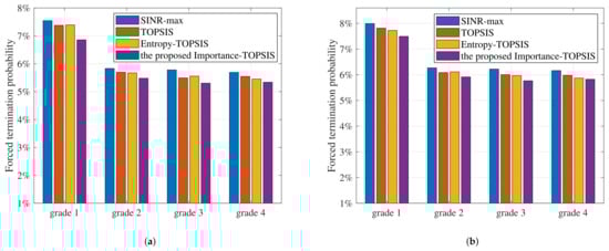 Figure 6 shows the forced termination probability, which is the probability of a call being dropped during the communication of different services grades when the user arrival rate is 5000 per hour. The Importance-TOPSIS scheme has the best performance in the forced termination probability, the other three schemes have similar forced termination probability, and the SINR-max scheme is slightly worse. Combined with Figure 4, part of the reason SINR-max scheme performs worse in system throughput is that the forced termination caused by the load balancing of LEO constellation is not considered. As the services of grade 2, 3, and 4 can connect to the GEO satellite, the probability of forced termination is smaller than that of grade 1.