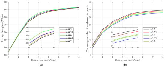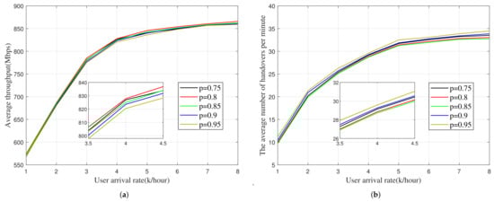 As shown in Figure 7, the system average throughput and the handover times change with the variation of p. In general, the value of p in our method has good results in the range of 0.75–0.85, which is similar to the description in Equation (7). Compared with the results obtained by different strategies in Figure 4 and Figure 5, if p is not in the optimal range, its results may be worse than those of other strategies.