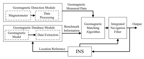 The basic block diagram of the geomagnetic matching navigation algorithm is shown in Figure 1. The pre-planned geomagnetic field matching feature quantity in the driving area is drawn into a reference map, which is stored in the database of the computer. Then, when the carrier passes through the area, the geomagnetic measuring device on the carrier measures the matching feature quantities of these points in real time, thus obtaining a real-time map. By matching the measured data with the reference map, the real-time position of the carrier is determined, and the accumulated error of the inertial navigation system is compensated, so as to achieve the purpose of high-precision autonomous navigation [12,13].