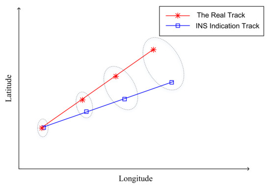 In practical applications, the sensor has inevitable errors, which cannot meet Hypothesis 1. In addition, when there is no adaptive area to choose from in the vehicle driving area, the ICCP algorithm caused by rigid transformation is easily affected by the accumulated errors of the inertial navigation system. As the increase of navigation time, the positioning error of each measuring point also increases, and the track indicated by inertial navigation gradually deviates from the real track. In these cases, if the Hypothesis 2 is not satisfied, the matching error of the iterative transformation using the ICCP algorithm will continue to increase. Therefore, it is necessary to study other methods to estimate the inertial navigation error, narrow the matching range, and obtain the approximate position of the AUV. Then, the ICCP matching algorithm is adopted to further improve the matching accuracy.