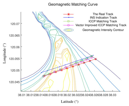 The autonomous navigation with long-endurance and high-precision are key performance parameters for Autonomous Underwater Vehicles (AUV). The measurement error of Inertial Navigation System (INS) accumulates with time, so INS needs to be corrected periodically by other auxiliary methods. An effective method is to integrate geomagnetic navigation and inertial navigation [1,2]. Many scientists around the world are studying geomagnetic navigation. For example, in the complex indoor environment, inertial navigation system can not meet the current accuracy requirements. In this article [3], the author puts forward the integration of geomagnetic and visual sensing for indoor positioning for the first time, so as to give full play to the advantages of geomagnetic field and visual image. In this article [4], in order to avoid the influence of time-varying noise and weak illumination on slam, the author proposes a magnetic gradient-aided navigation method based on adaptive slam. The combination of magnetic gradient information and slam is an effective solution. In this article [5], the author proposes a return navigation algorithm based on magnetic field information matching. When the information of user position or target position is missing, the trajectory segmentation is used to reduce the error accumulation, and the magnetic field information matching is used to correct the navigation error at the turning point. There are other navigation methods, such as comparative navigation, which is also a solution of autonomous non-global navigation satellite system. In this article [6], the author adopts a new processing and analysis method for 3D multibeam sonar data, which has high real-time, good effect and strong readability, and improves the accuracy and efficiency of comparative navigation. The navigation algorithm is the core of geomagnetic matching-aided navigation. The Iterative Closest Contour Point (ICCP) matching algorithm is derived from the Iterative Closest Point (ICP) for image matching. It is mainly used to solve the matching between the track feature sampling points and feature contours. In this article [7], the author proposes a federated integrated navigation method based on two-stage position matching technology. The position matching in the first stage is based on the iterative closest contour point, and then the position matching in the second stage is based on affine algorithm to solve the limitation of the rigid transformation of the traditional iterative closest contour point. Using geomagnetic information entropy and geomagnetic difference entropy as the reference standard of geomagnetic-assisted navigation area, selection can effectively correct the initial error [8]. The magnetic field matching positioning error is used as the observation to estimate the error generated by the inertial navigation, and the Kalman filter is utilized to estimate the INS optimally, which can accurately locate the target [9]. The improvement of vector features can solve the mismatch problem of the geomagnetic matching algorithm in areas with similar total geomagnetic features and enhance the positioning accuracy [10].