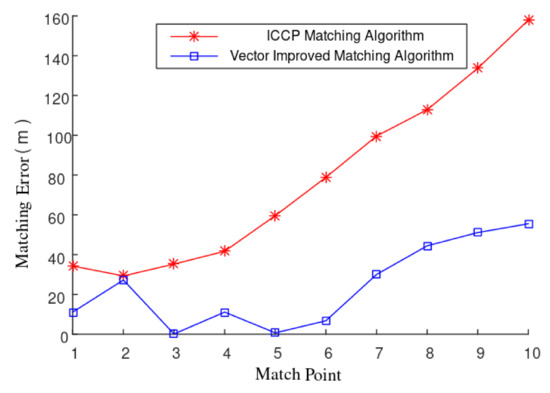 The average positioning error, average heading error and matching time of the two ICCP matching algorithms are calculated, as shown in Table 1. According to the matching results, the vector improved ICCP algorithm can reduce the average position error from 783 m to 238 m, and the average heading error from 7.54° to 4.22°. According to the analysis of the algorithm implementation process, the vector improved ICCP algorithm replaces a large search area with an error ellipse, and the matching time is shortened from 15.62 s to 9.53 s. From the analysis of the algorithm implementation process, the vector improved ICCP algorithm replaces a large search area with an error ellipse, and the matching time is shortened from 15.62 s to 9.53 s.