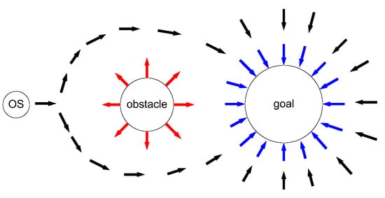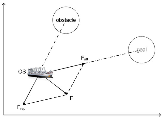where N is the total number of all obstacles. The goal puts an attraction on the OS, attracts OS to approach gradually, and finally arrives. The obstacles repulse OS to avoid collisions. The derivatives of the attractive potential function and the repulsive potential functions are an attractive force function and the repulsive force functions, respectively, written as