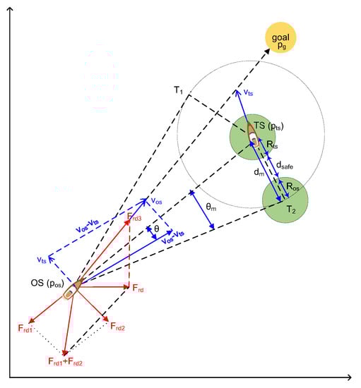 where is the preset influence range of the TS and is the radius of an artificial safety margin of the OS. and are the speeds of TS and OS, respectively. is the angle between the vector () and the relative speed vector (), and is the relative speed vector from the OS to the TS. = , CR is the sum of and . , , and are the positive scaling factors for the dynamic the TSs, static obstacles, and emergency action, respectively. is the attractive force in term of the position, shown in Equation (15). is repulsive force of the position and the velocities, shown in Equation (19).
