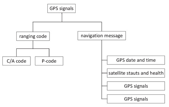 Global Positioning System (GPS) is a satellite navigation system, which provides position, navigation, and timing for land, sea, and air in the world [30]. Furthermore, a GPS is an important navigation device for an unmanned ship [31]. A GPS consists of three parts, including space, control, and a user device. The space part of aGPS consists of 27 GPS satellites (24 active and three standby). The GPS control part consists of one main control station, five detection stations, and three injection stations. The GPS user device part includes a GPS receiver and other devices. The basic principle of a GPS navigation system is to measure the distance between the satellite and the user’s receiver and calculate the receiver’s position by integrating the data of multiple satellites. The GPS signals include a carrier at L1 and L2, Pseudo Random Number (PRN) code at civil code (C/A) and military code (P-code), and navigation data. The GPS signals include raning codes and the navigation message, shown in Figure 4. The GPS system must modulate the ranging code and navigation information onto a carrier frequency before it can be transmitted to the receiver. The frequencies are utilized, including the L1 frequency at 1575.42 MHz and the L2 frequency at 1227.60 MHz. Coarse/Acquisition code (C/A code) is transmitted on the L1 frequency as 1.23 MHz signal. Precision code (P-code) is transmitted on both L1 and L2 frequencies as 10.23 MHz signal.