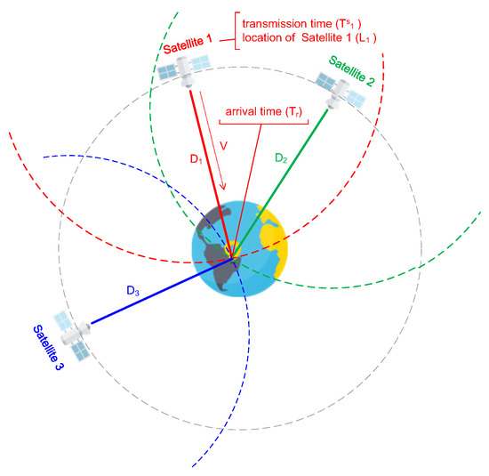 where , , and V are known scalars. Combining Equations (21) and (22), we can know that the receiver location (L) can be calculated when at least three satellite signals are received. In geometric space, a satellite defines a transmission circle with radius . At least three of these circles intersect with the earth’s surface, where the receiver is located