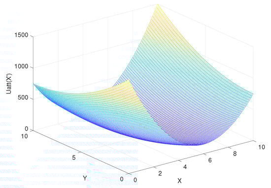 where , , and represent the artificial potential field, the attractive potential field, and the repulsive potential field, respectively; and X is the position of the OS. In addition, the attractive potential field is written as