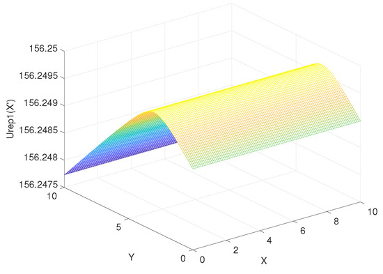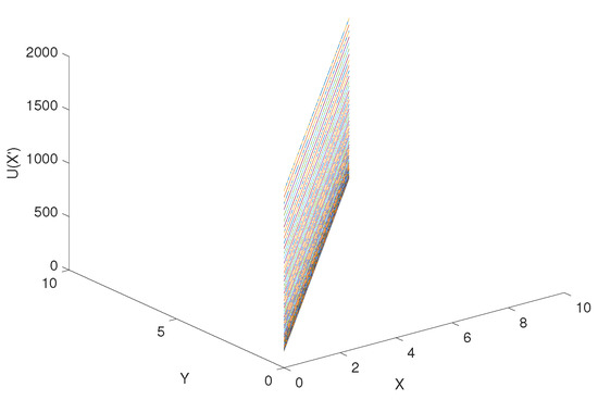 According to Equation (34), assuming that x and y are from 0 to 10, the step is 0.1, is from 0 to 10, the step is 0.1, the coordinate of goal = (10, 10), the coordinate of obstacle = (4, 8), the attraction gain = 50, the repulsive gain = 15, and the influence distance of obstacles = 0.4, we can get the curve of the influence of change rate on , as shown in Figure 9. Similarly, according to Equation (35), the curve of delta change rate on can be obtained, as shown in Figure 10. The influence of change rate on the resultant force of attraction and repulsion is shown in Figure 11.
