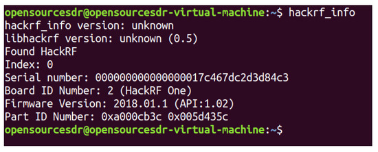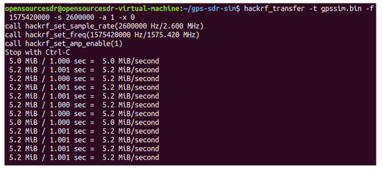 We connect HackRF ONE to the computer with USB and test whether the host installation is successful in the shell terminal of Ubuntu, as shown in Figure 18, which proves that the hardware system of HackRF ONE has been successfully connected to the computer. HackRF ONE is a full open-source hardware and software project that can provide Software Defined Radio (SDR) solutions. The wireless communication protocol based on software definition can replace the hardware connection so that the frequency band, air interface protocol, and function can be upgraded through software download and update without replacing the hardware. We use HackRF ONE to transmit the fake GPS data we simulated above, as shown in Figure 19. After waiting for 3–4 min, we open the app of GPS Test Plus and find that the mobile phone position has been changed to a fake GPS spoofing position, as shown in Figure 20.