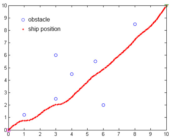 We use Matlab to simulate the path planning of the unmanned ship using the APF method, as shown in Figure 21. The algorithm needs to set the start position, goal position, obstacle position, gravity and repulsion gain coefficient, obstacle influence distance, step, and iteration times.