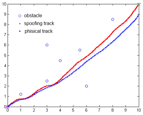 According to the above formulas, if the position of OS is , the next position of OS calculated by the APF algorithm is . If the attackers change the position of OS by the GPS spoofing, we find that the next position of path planning results of OS will be changed, shown in Table 2. By analyzing these data, we can see that the farther the false position is from the physical position, the greater the coordinate change of the next position of OS. To prevent GPS spoofing from being found, the false position needs to be as close to the physical location of OS as possible and changes continuously with time.