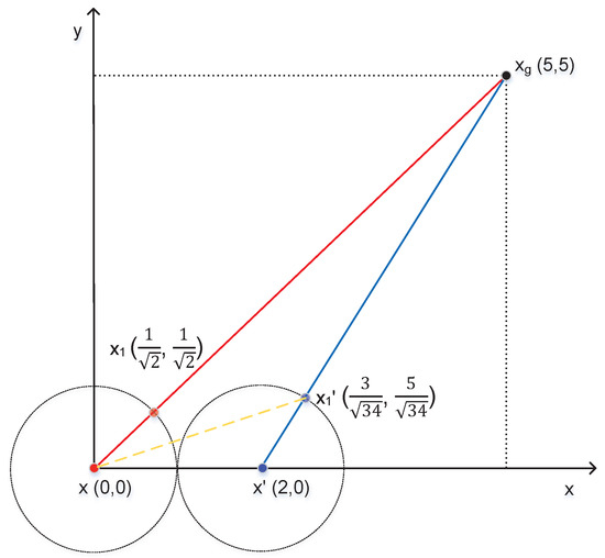 In the environment of both attraction of goal and repulsion of an obstacle, the attacker can influence the result of path planning based on the APF method through GPS spoofing. We use a practical example to illustrate the influence of GPS spoofing on path planning results by the APF method. In the Cartesian coordinates, we assume that = (10, 10) is position of the goal, x = (0, 0) is the initial position of OS, and are the positions of the first obstacle and the second obstacle, respectively. and are the attraction gain and the repulsive gain, respectively, is the step length of OS. is the influence distance of obstacles. When the distance between the obstacles and OS is greater than this distance , the repulsion force is 0. is the angle between the line from the position of OS (x) to the goal () and the x-axis, is the angle between the line from the position of OS to the first obstacle () and the x-axis, is the angle between the line from the position of OS to the second obstacle () and the x-axis. First of all, we calculate the values of , , and according to the following formulas.
