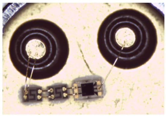 The experiments for the APD reliability assessment were conducted using a TO-46-can-type module. The TO module assembly process was as follows: (1) The APD CoC and resistor were attached to the TO-46, header as shown in Figure 2; (2) the window cap sealing was produced by the resistance-welding technique to maintain hermetic conditions. A specially designed aspherical lens cap was resistance-welded in a nitrogen atmosphere to obtain a hermetic sealing. Here, the tested APDs were electrically connected with two 1-kΩ resistors in series, as shown in Figure 2, to avoid unexpected sudden APD chip damage from bias voltage fluctuation or shock.
