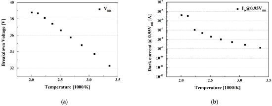 Temperature dependence of (a) the breakdown voltage (VBR) and (b) the dark current (ID) characteristics.