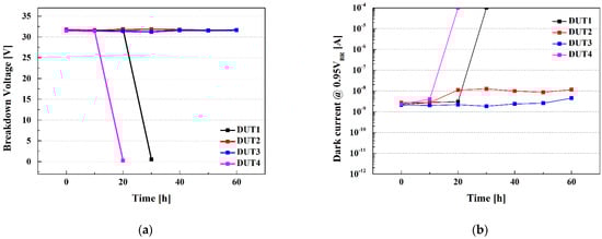 Monitored electrical characteristics of the (a) breakdown voltage (VBR) and (b) dark current (ID) at 448 K with 1000 μA.