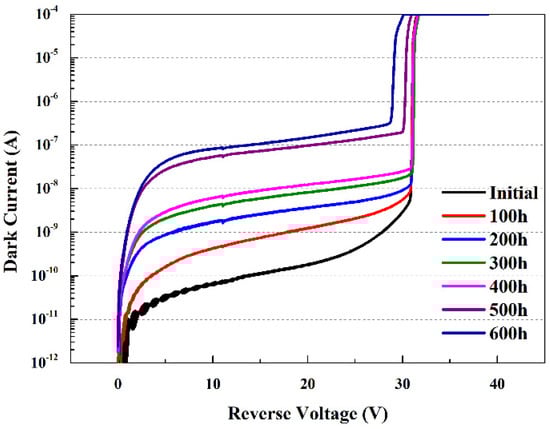 The main ALT experiments were composed of four groups of hybrid stresses: two distinct thermal stresses (473 K and 498 K) and electrical stresses (500 μA and 1000 μA). The current–voltage (I–V) characteristic variation during the main ALT experiments and the monitoring characteristics of the breakdown voltage (VBR) and dark current (ID) under the conditions of 473 K with a constant current stress of 500 μA are presented in Figure 8 and Figure 9, respectively. Similar results were observed under all test conditions of the main ALT experiments. In the figures, it can be observed that the dark current increased and the breakdown voltage decreased when the tested APD was degraded.