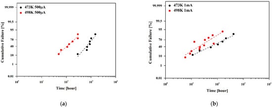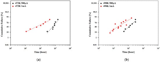 However, the pre-ALT experiment with four tested APDs under a current stress of 500 μA at 448 K also showed nearly no degradation for 2000 h, indicating that the mean time-to-failure (MTTF) could not be estimated under these conditions, as shown in Figure 6. Based on these two test results, the third accelerated life test under a current stress of 1000 μA at 448 K was conducted on the four tested APDs. Unlike the preceding experiments, device failures were observed under this test condition, as depicted in Figure 7. Therefore, the appropriate test conditions considered for the ALT experiments included current stress levels of 500 μA and 1000 μA at the elevated temperatures of 473 K and 498 K. There were eight tested APDs used for each test condition; however, the results of the APDs tested under the current stress of 1000 μA at 498 K were not considered because the device failures were observed in a short period of time; thus, the statistical significance could not be confirmed. Therefore, an additional five tested APDs were used for the test conditions of 1000 μA at 498 K.