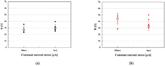 First, to verify the failure mechanism during device failure, the resistance of the failed APD was computed and is shown in Figure 12. The output data of the median resistance and standard deviation are summarized in Table 3. Although there were some variations between the resistances under different conditions, the results confirm that the series resistance mounted inside the TO-46 did not degrade during the ALT experiment. Because the tested APDs had two 1 kΩ resistors connected in series, the failure of the APD was mainly due to the APD device itself. In addition, the failed APDs showed different resistance values correlated with the initial I–V characteristics and the effect of edge breakdown in the guard-ring region, which was verified using IR thermography.