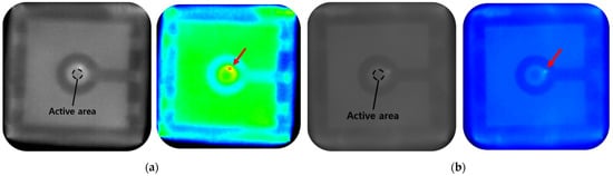 With IR thermography, the failure mechanism of the tested APDs was further investigated by measuring with FLIR SC5000 in Wooriro []. As shown in Figure 13, the red spot indicates premature edge breakdown, which is a conventional failure mechanism of LM APD []. Figure 11a,b show the IR results of the failed devices under the conditions of 500 μA and 1000 μA at 498 K, respectively. Based on these results, the failure mechanism was confirmed to be due to the edge breakdown near the guard ring region of the tested APDs.