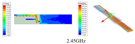 Surface current and E field simulation results at 2.45 GHz, 5.5 GHz, 6.7 GHz.