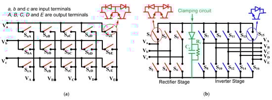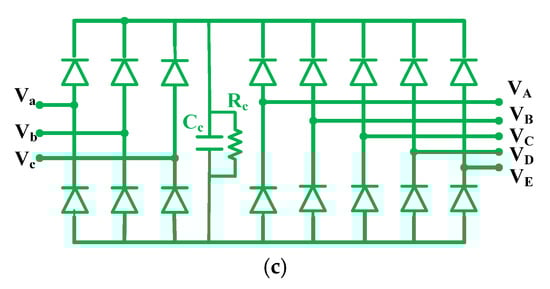 The lack of the DC connection, which is common in other voltage-source-inverter topologies, is one of the most appealing features of the MC design when used in aviation applications. As a result, with an MC, no electrolytic capacitors are needed. Therefore, the removal of the load’s energy in some situations, such as an over-current situation, a failure in the commutation process, and/or during start-up of the operation of the MC, might cause overvoltage at the converter’s input because the matrix converter does not have an energy-storage facility. A diode bridge with ultrafast diodes linked to each input and output side of the MC, as well as a capacitor, is definitely the most commonly employed protection approach []. However, this two-bridge clamping circuit can be easily replaced by the simple clamping circuit shown in Figure 1b. It consists of only one diode and one capacitor.