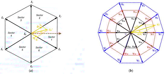 There are only nine switching states allowed for these switches in order to prevent a virtual DC-connection open circuit. These switching states are six non-zero (active) vectors () and three zero vectors () as represented by the hexagon in Figure 2a. For both the zero and active vectors, the duty cycles are determined using the yellow-colored vectors in Figure 2a, as shown in Equations (2)–(4) [].