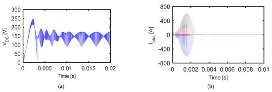 Figure 6 displays the simulation results for testing of the clamping circuit at start-up with the operation of the PWM of the rectifier. It can be noticed from Figure 6b that there is an extremely high supply current while charging the capacitor up to about 600 A, which causes current protection to work and a sudden trip of the circuit breaker occurs, and as a result an extremely high voltage occurs that causes the breakdown of matrix switches. Hence, the rectifier PWM must be stopped during the start-up of the MC.