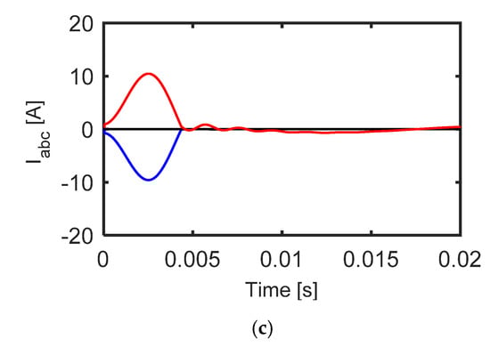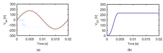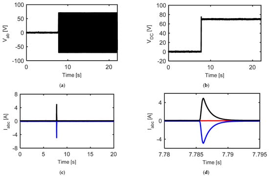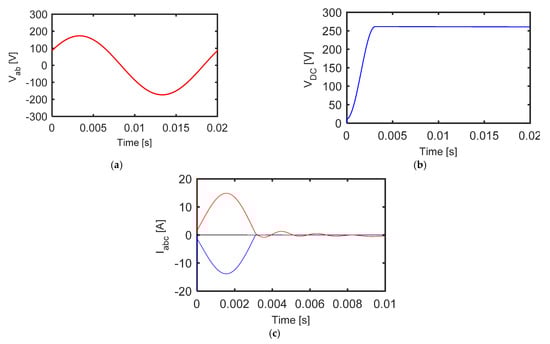 Figure 7 describes the simulation results for the testing of the clamping circuit at start-up without operation of the PWM of the rectifier, and with the capacitor being charged using any line voltage, e.g., Vab. It can be noticed from Figure 7c that the maximum input current during capacitor charging is about 15 A. However, there is a high pulse current at time zero. This is because the start-up is not at zero voltage, as shown in Figure 7a.